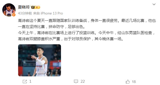 “今天上午,高詩巖在比賽場上進(jìn)行投籃訓(xùn)練。今天中午,經(jīng)山東男籃隊醫(yī)檢查,高詩巖雙腿膝蓋積水嚴(yán)重,出于對球員保護(hù),其今晚休賽一場?!?/p>