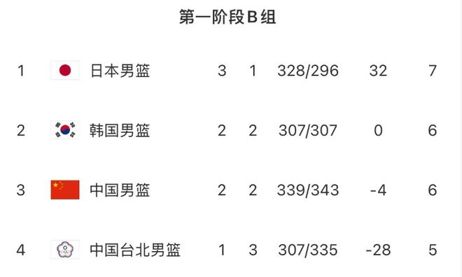 中國(guó)男籃先后逆轉(zhuǎn)日本隊(duì)和中國(guó)臺(tái)北隊(duì),拿到4分的積分;加上開(kāi)局階段被韓國(guó)隊(duì)雙殺,拿到2分,中國(guó)男籃4場(chǎng)比賽的最終積分為6分。韓國(guó)隊(duì)同樣為6分。